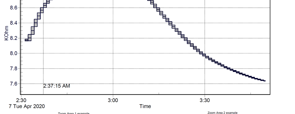 For those interested in the thermal time constants of the loop, I did extermiment with fans on the radiator, and recorded the thermistor resistance using my Fluke 289 connected to desktop via FlukeView.